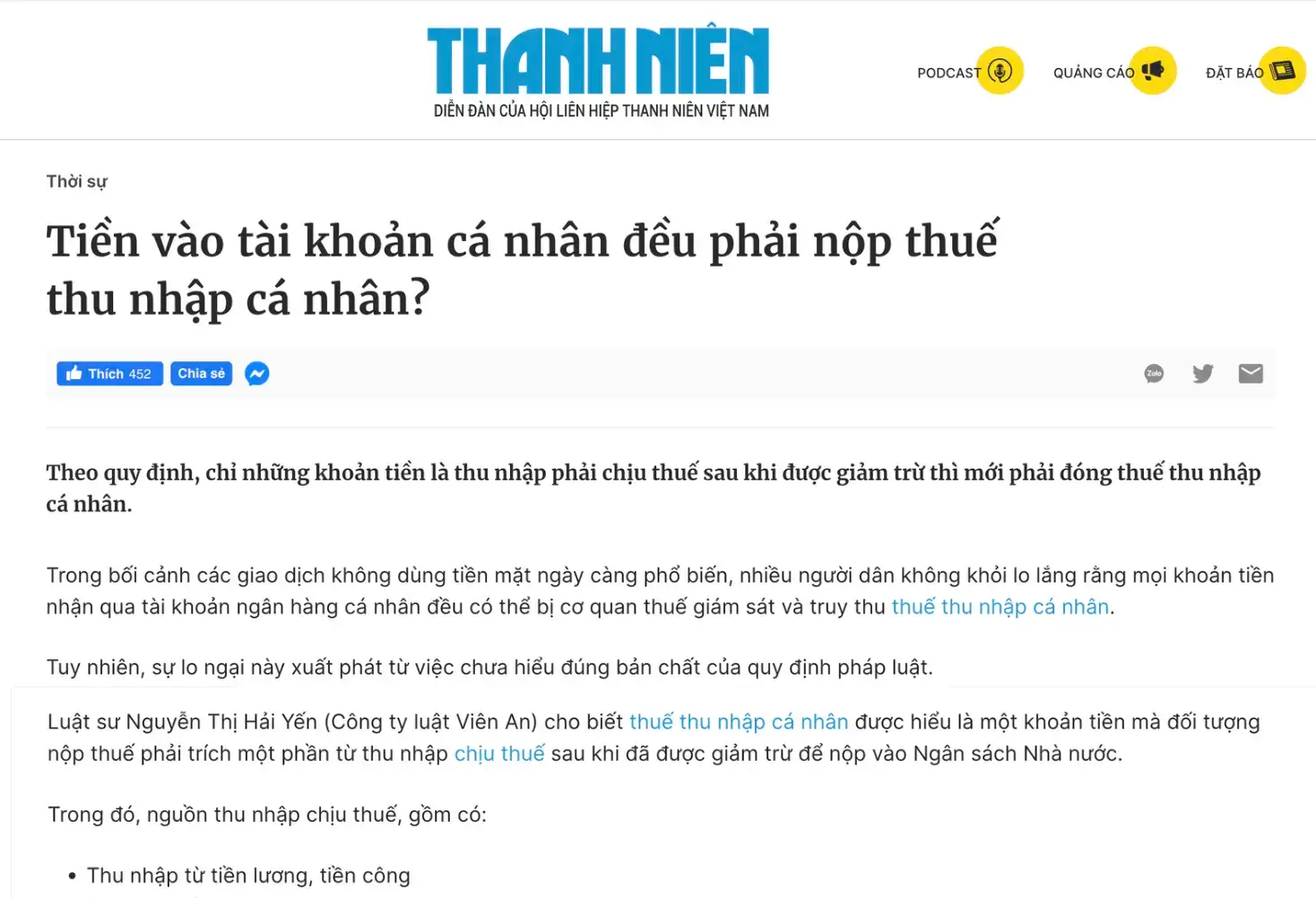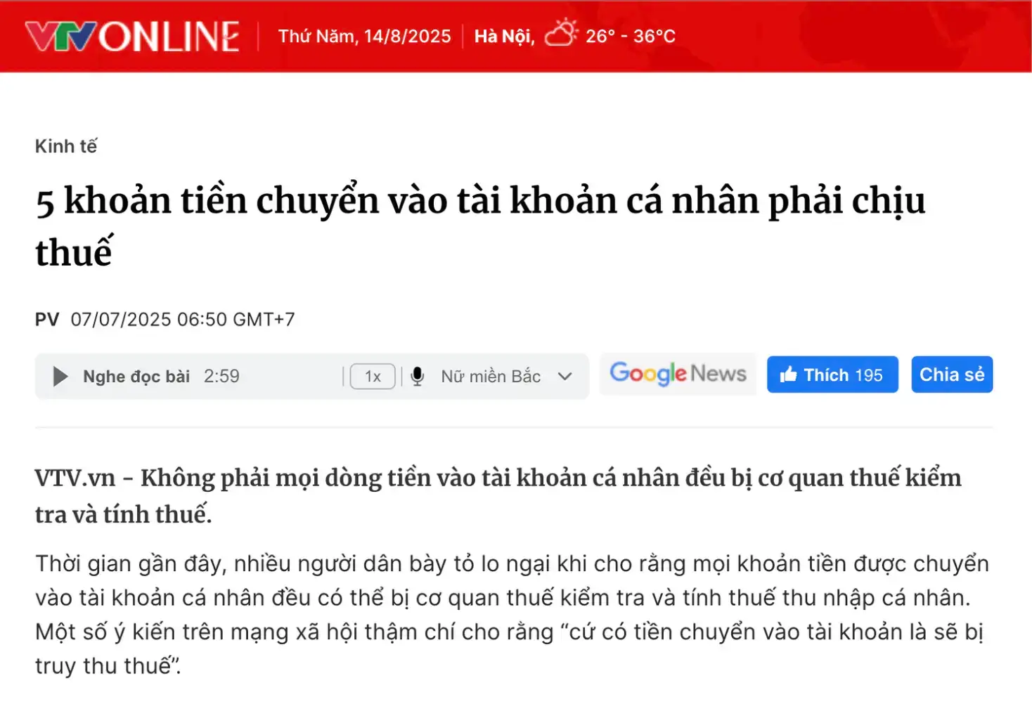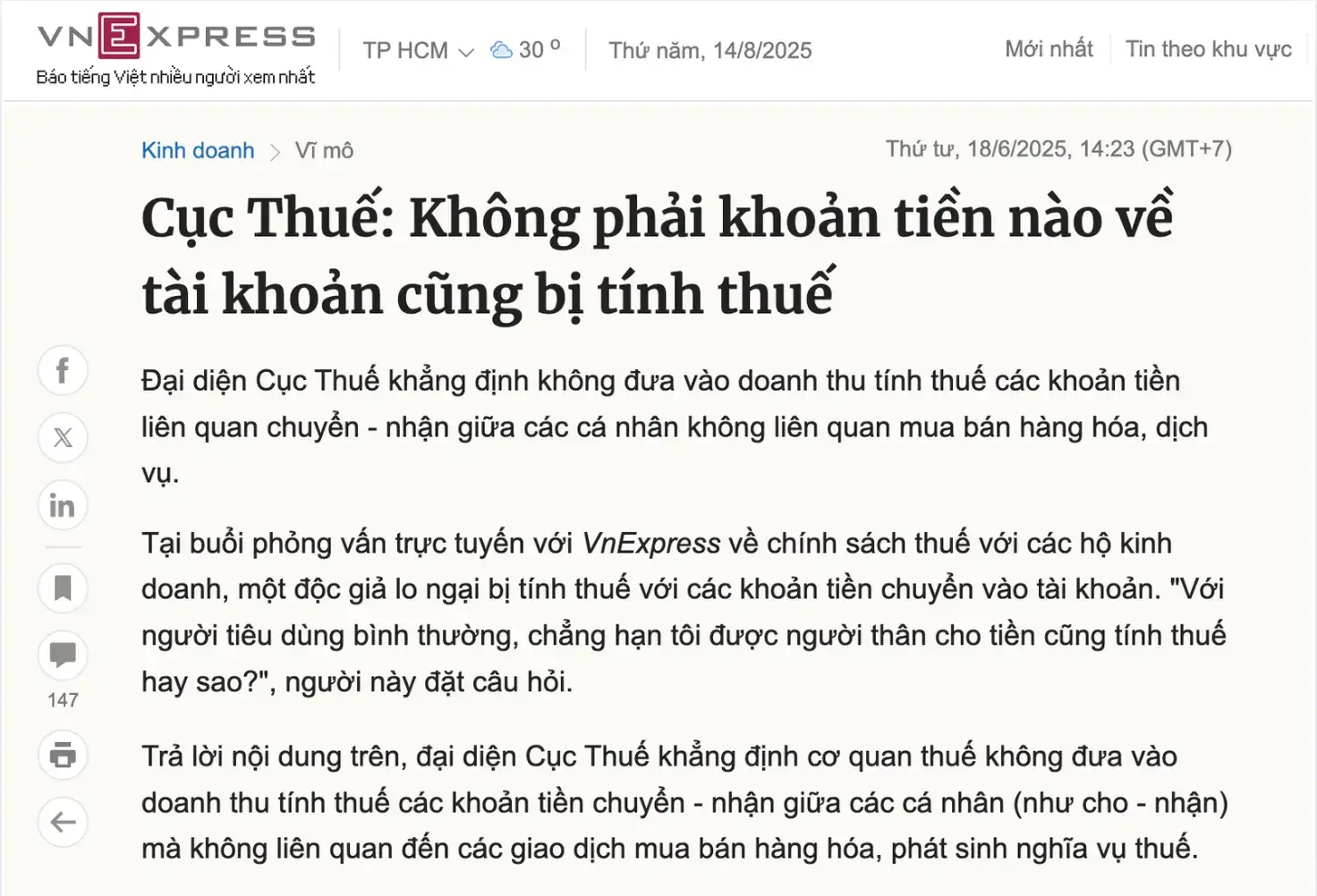 VnExpress: “Chỉ những khoản thu nhập từ sản xuất, kinh doanh mới bị đánh thuế. Các giao dịch cá nhân không liên quan kinh doanh sẽ không bị tính thuế và không bị truy thu.”